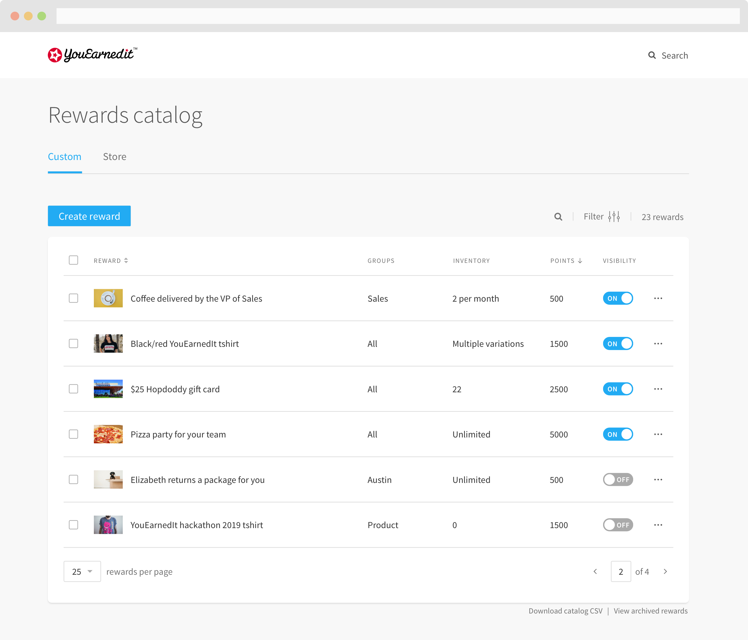 For example, admins can track inventory with custom rewards but not store rewards (YouEarnedIt manages inventory for those). Therefore, I only surfaced the "Inventory" column for custom rewards; store rewards have the "Availability" column.
