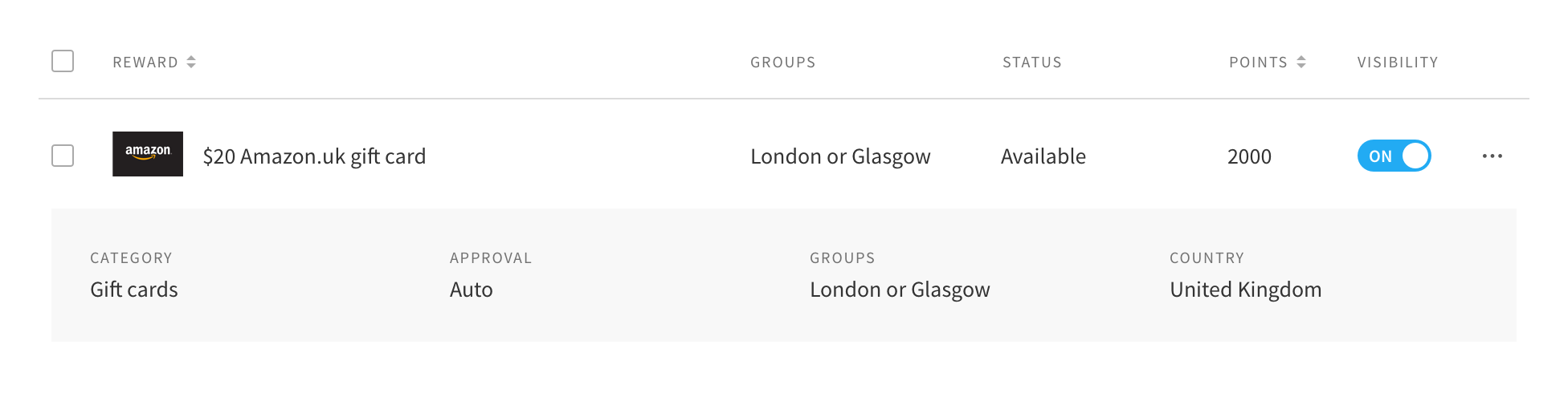 My solution was to surface the reward country in the row’s expanded view, so that admins can make sure they have rewards assigned to the right international groups. In the future, we hope to reinvision the way the product structures groups.