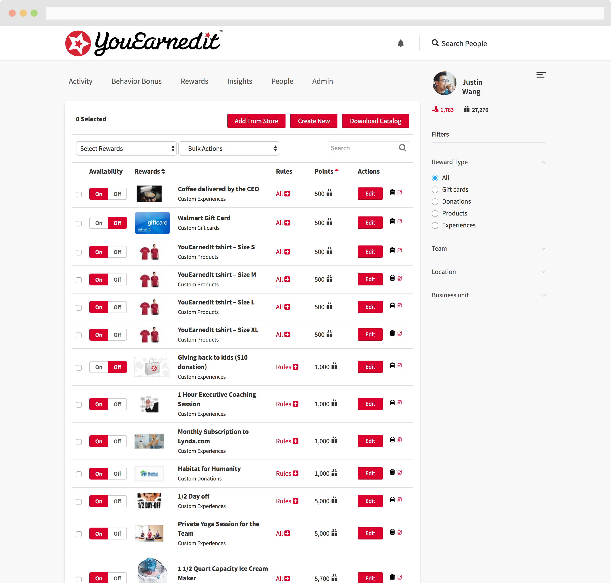 Custom rewards and YouEarnedIt-fulfilled rewards were treated the same, even though custom rewards have different attributes and require more management from admins.