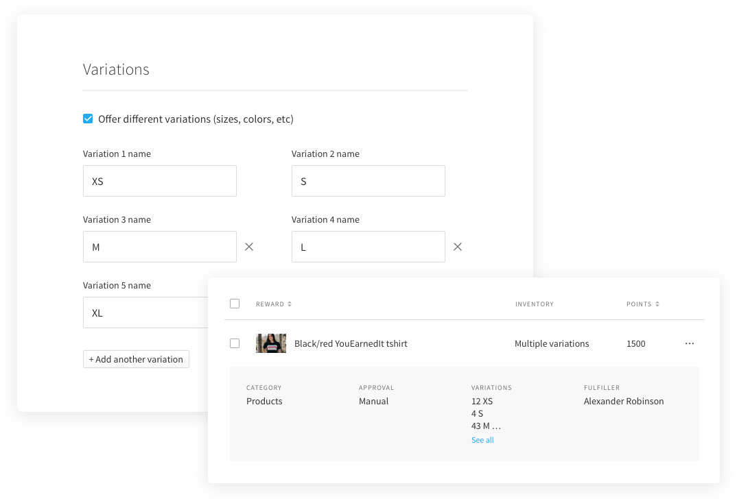 An important feature in the new design was the concept of variations (sizes, colors, etc). Previously, admins would have to make individual reward listings for each size or color.